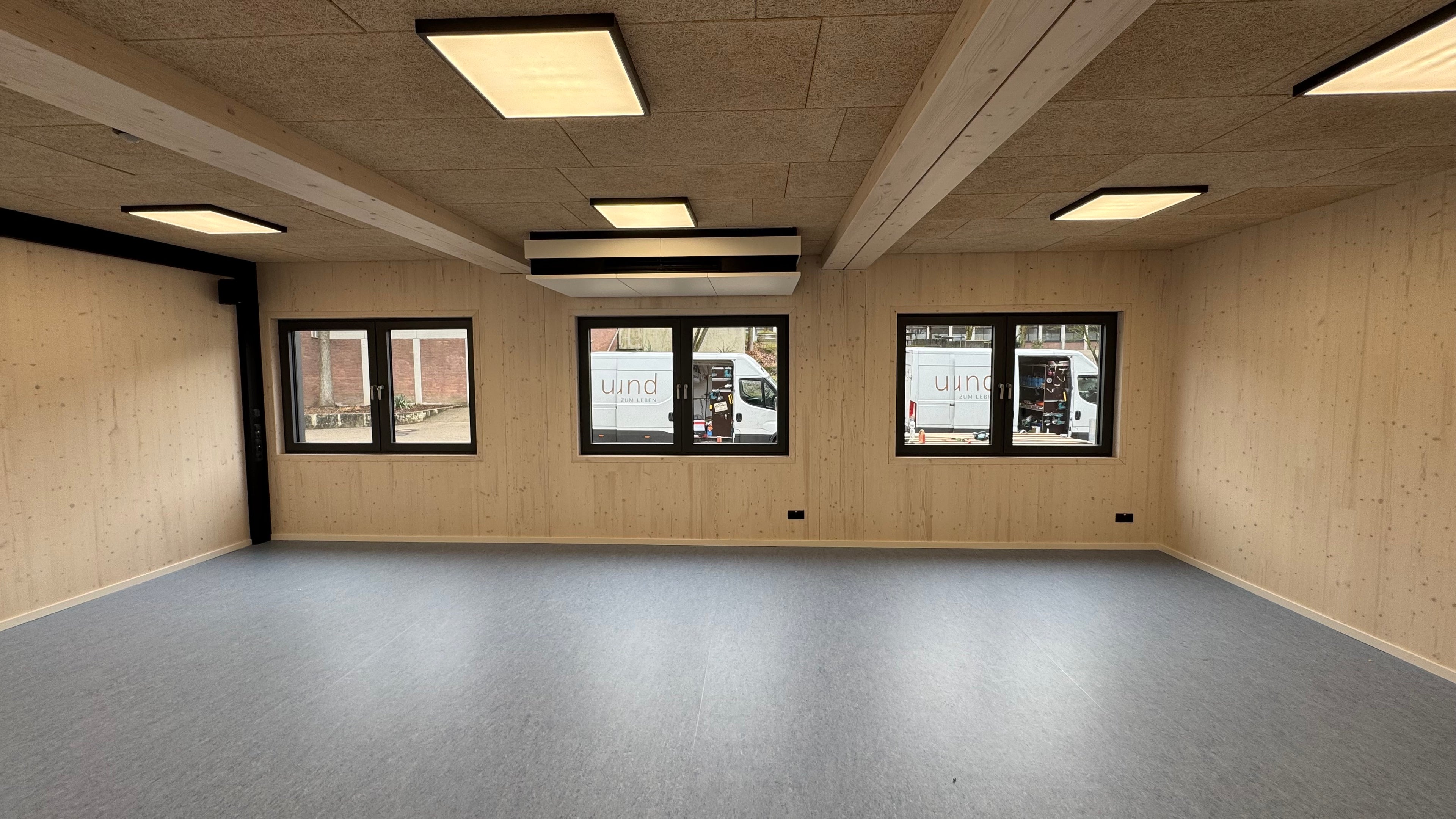 Die G. Ungrund GmbH realisiert in Mönchengladbach ein Schulgebäude mit zwei Klassenräumen und zwei Differenzierungsräumen in Holzmassivbauweise. Die Aufstellung der insgesamt acht Module erfolgte innerhalb eines einzigen Tages.