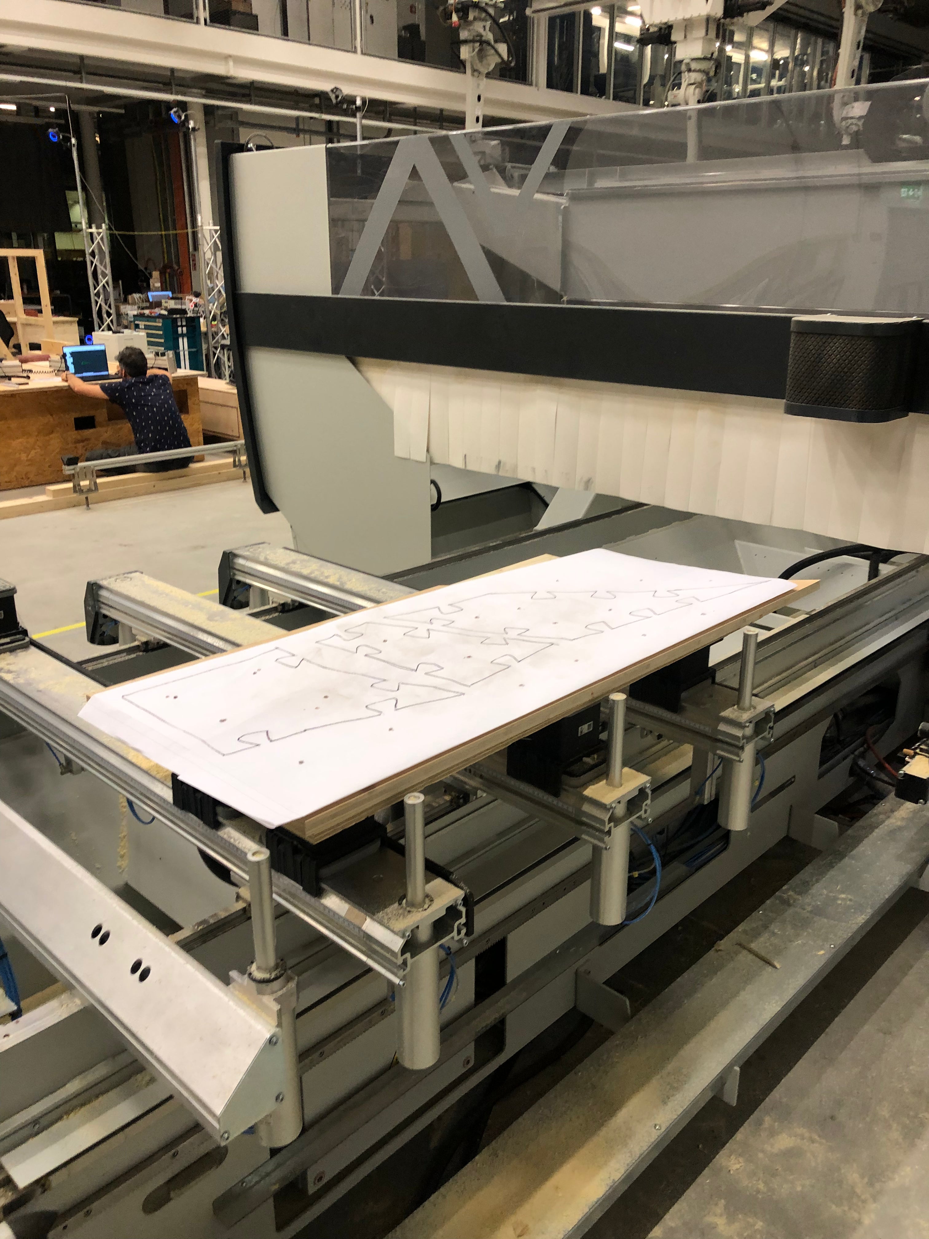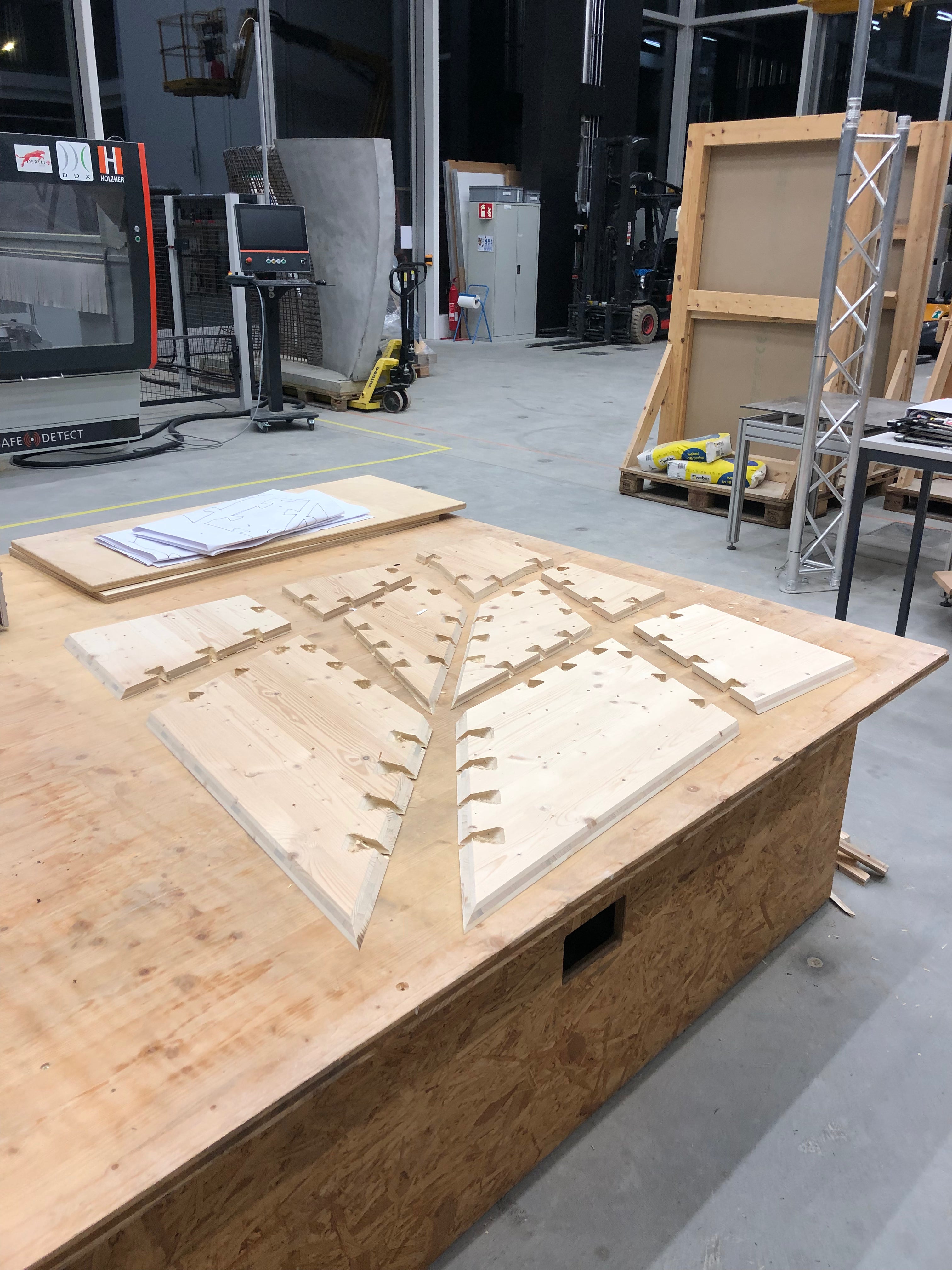 Im Rahmen einer Vertiefungsarbeit in Technologie und Architektur wurde bei Gramazio Kohler Research an der ETH Zürich ein Prototyp für eine modulare Bodenplatte aus CLT-Platten hergestellt. Die strukturelle Idee basiert dabei auf dem Prinzip des Faltens, um Material-effizient statische Höhe zu erreichen. Das Projekt ist komplett in Python geschrieben und parametrisch aufgesetzt.