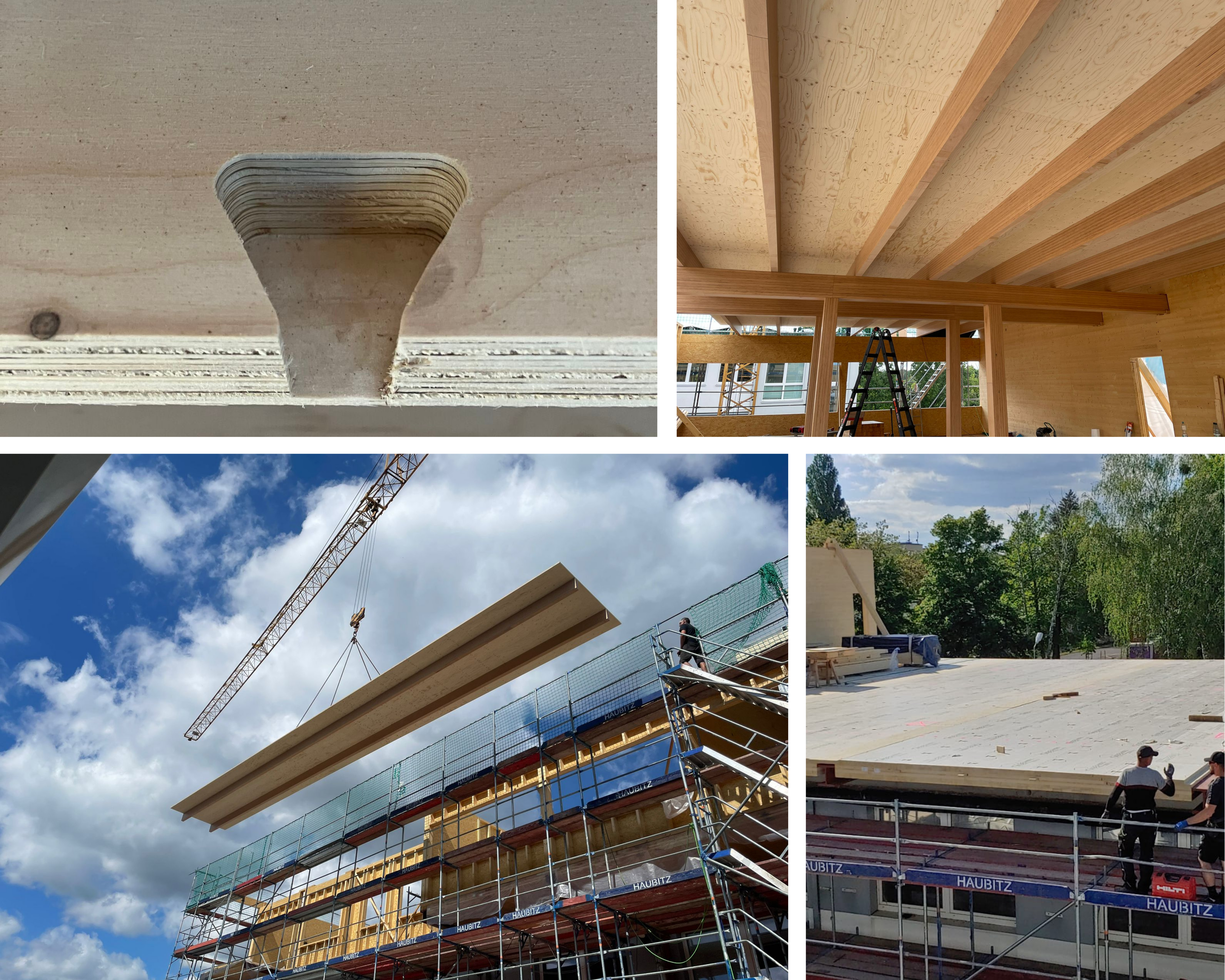 The roof deck consists of prefabricated, approximately 18 m long, 2.49 m wide "Pi panels", consisting of two supporting ribs made of GL75 beech and a ceiling mirror made of 39 mm thick KERTO-LVL panels.
